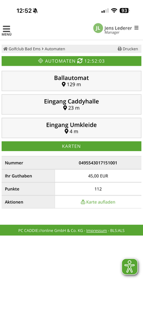 Sofern Sie einmal ihren DGV-Ausweis oder ihren Transporter zu Hause vergessen haben, können Sie nun über die APP ganz bequem die Türen zur Caddyhalle sowie zu den Umkleiden öffnen. Auch können Sie hierüber die Ausgabe am Ballautomaten starten. Fehlendes Guthaben für Driving-Range Bälle lässt sich ebenfalls in der PC Caddie App über eine Kreditkarte oder einen Paypal-Account aufladen.